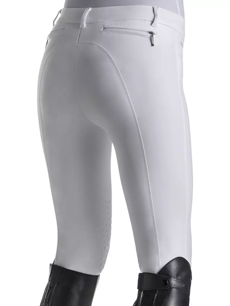 The EGO7 Jumping EJ are the most popular EGO7 breeches. With flattering front pockets and zip pocket to back, superior performance and style is guaranteed thanks to the signature cut developed by Italian designers and the use of the best technical fabrics. The revolutionary fabric, 100% jersey, made in Italy provides superb 4 way stretch ensuring a perfect fit, unrestricted movement, support and shape retention. EGO7 breeches feature a patented COBRAX button, and innovative grip knee patch inserts for exceptional sticking power. On the interior of the waistband there is a discrete silicone grip to prevent shirts untucking. Â