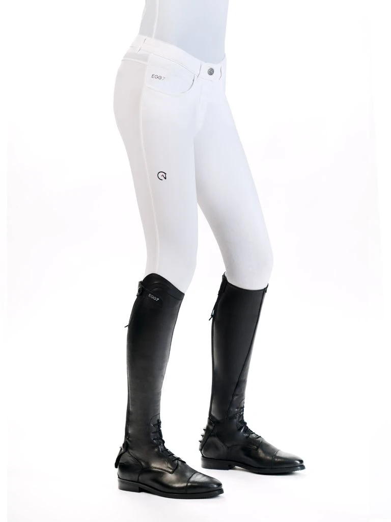 EGO7 JUMPING VB, the women’s horse riding breech with flattering front pockets and back push up detail, low rise, performance and modern style made in Italy, comfort stretch leggings fabric, light weight, breathable and moisture-wicking. Light weight, moisture wicking fabric makes these ideal for summer wear. The modified low rise sits fashionably low in front but rises in the back. Innovative grip knees help keep you in place in the saddle, this is also on the interior of the waistband to ensure shirts stay tucked in. Perfect for competition and everyday riding