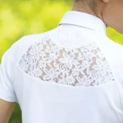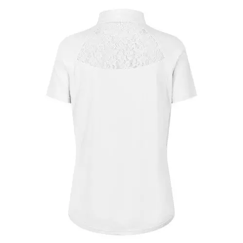 The Equetech Parade Show-Time Shirt is a premium, Technical showing shirt, crafted from functional 4-way stretch wicking fabric, which allows freedom of movement and helps to keep you feeling fresh and cool all day. Features pretty lace back panel for ventilation and style, press button-down petite collar, loop tie stay with and easy-wear zip at neck. Machine washable. 90% Polyester/ 10% Elastane. Sizes up to a UK 24 as standard.