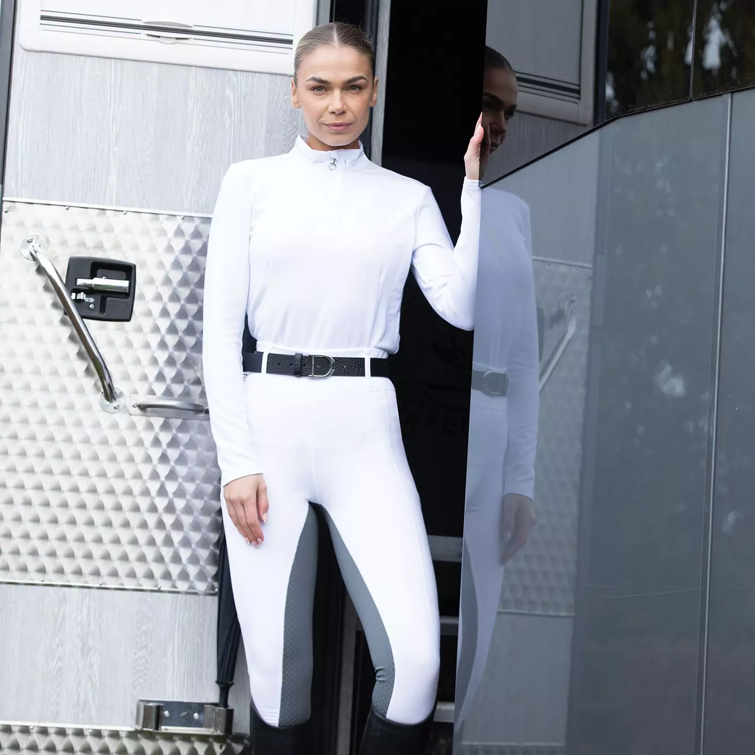 Technical thermal stretch winter competition shirt, with brushed fleece lining. Ideal for winter dressage and riding club activities. Features front zip front placket with Equetech horse bit puller, crystal detail around the collar and stock collar with loop to back to secure stock. Machine washable. Knitted 95% polyetser / 5% Lycra.Â