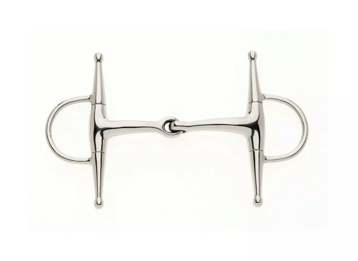 Full cheek applies a tiny bit of poll pressure when the rein aid is applied, and prevents the bit from being dragged through the mouth. Jointed mouthpiece uses a nutcracker action and contact with the roof of the horses mouth. Can be used in dressage competitions. Helps steering with green horses.