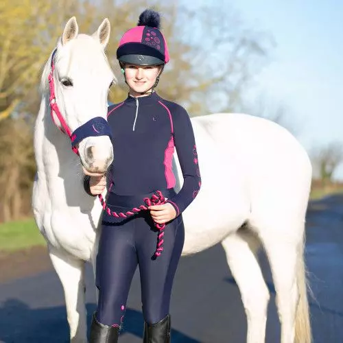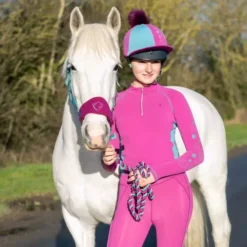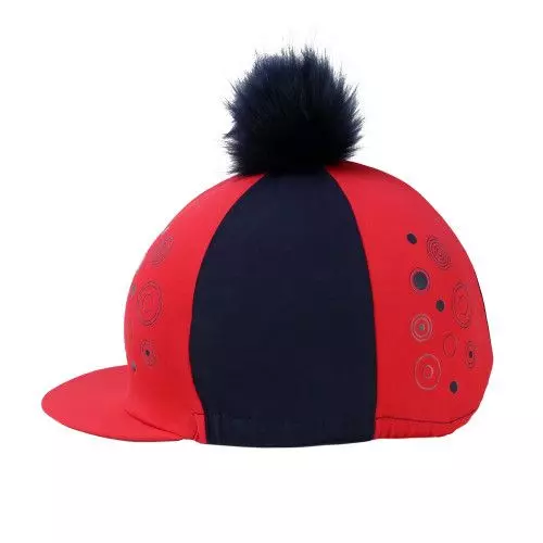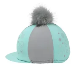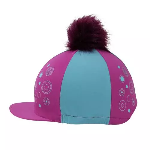 This two tone hat cover with co ordinating detachable faux fur bobble features a chunky circle pattern and stiffened peak. Made from stretchy lycra to allow it to fit all hat sizes. Matching base layer and riding tights available.