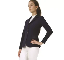There’s no such thing as too many diamantes! This jacket will dazzle and impress thanks to the navy and rose gold diamantes on the collar and pockets. The flattering, streamlined cut oozes sophistication and is bound to make you stand out from the crowd. The supple, flexible fabric allows for breathability even when the active rider is working and performing hard. This classic navy jacket is fastened with four navy buttons and a hidden zip.