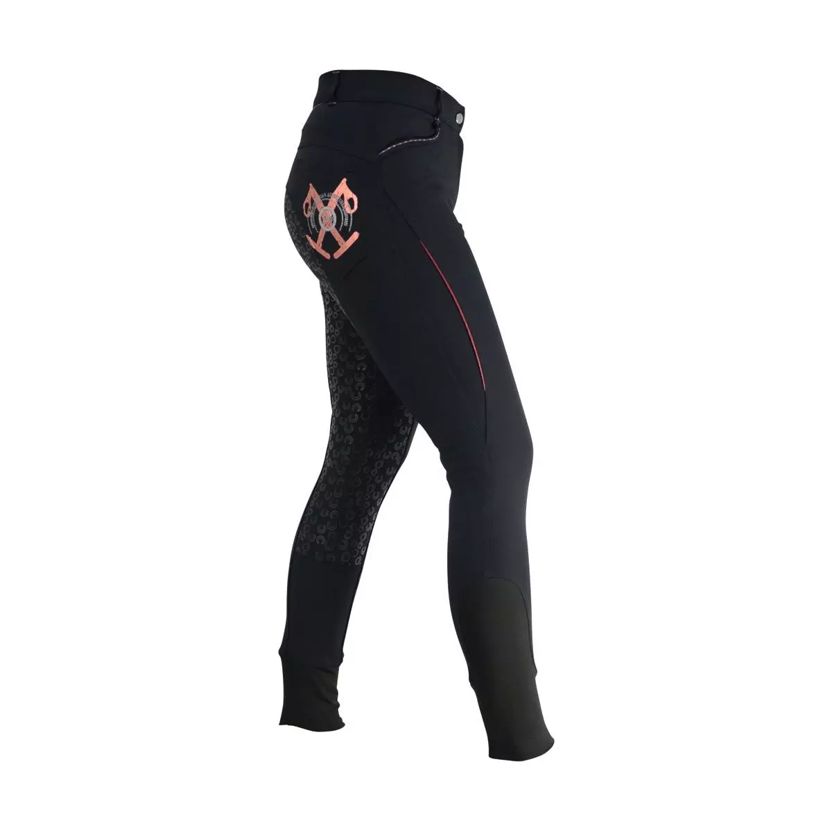 A must-have for the fashion-obsessed rider. Designed with a full silicon seat to give extra grip and security in the saddle, these breeches are decorated with a foiled rose gold detailing to make them really stand out. Further features include no bulk stretch hem ankles for a comfortable fit under long boots. The 4 way stretch provides freedom of movement whilst remaining super comfortable. These stylish breeches are completed with belt loops, a Hy embossed button and rose gold stitching on the front pockets to complete the look.