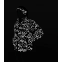 Reflective waterproof outer, warm padded lining, 2 zipped side pockets and 1 zipped chest pocket, elastic waistband, Velcro wrist adjustment, fleece lined collar
