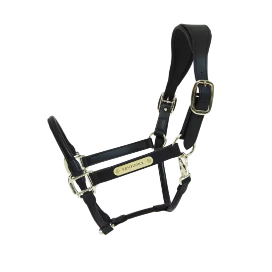 The Anatomic Leather Halter is made of artificial leather (100% animal friendly). This artificial leather does not absorb water or dirt, does not break or change color. It’s more flexible than real leather and therefore much nicer to use. Because it doesn’t absorb water, this halter is perfect for washing horses. The Anatomic Leather Halter is anatomically made and has a wider neck piece behind the ears. Therefore, the pressure is divided over a larger area. The nose piece is made of rolled artificial leather. The size can be adjusted on the left and right side of the head. The Anatomic Leather Halter features a gold colored plate with our engraved logo. It can be turned over and personalized. All closures are gold colored and are therefore a perfect match with our leads. The Anatomic Leather Halter can be cleaned with our Kentucky Horsewear Tack Cleaner. It was specially developed to clean our artificial leather. Very easy and efficient! Do not clean with glycerin soap.