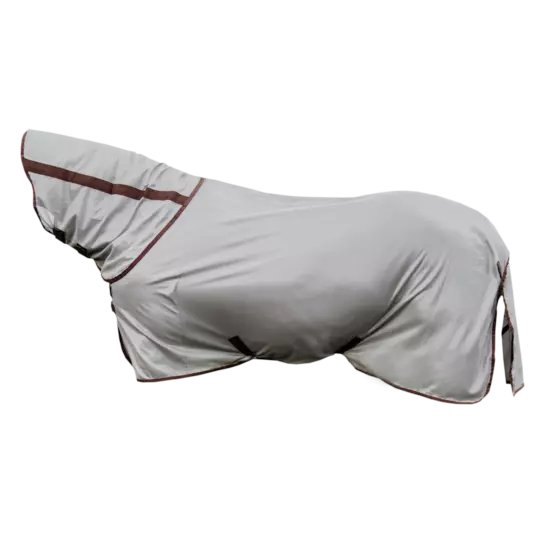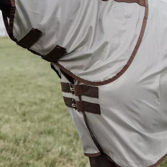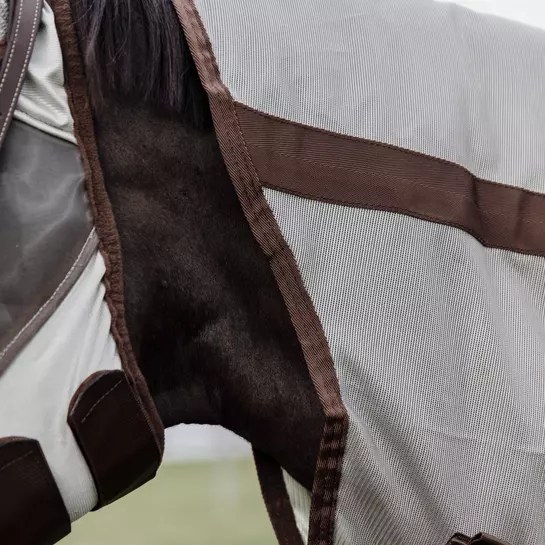 The fly rug is made from a dense structured mesh fabric, which keeps most bugs off. The mesh is extremely strong and will be an ideal field companion for many summers. The fabric is flat on the inside, this has a soft feeling and makes sure that no hairs will stick to the rug. Thanks to the light color of the rug, it will reflect the sunrays and does not absorb heat. The fine mesh still allows air permeability. The mane, chest and tail area are lined with a smooth polyester to avoid rubbing.
