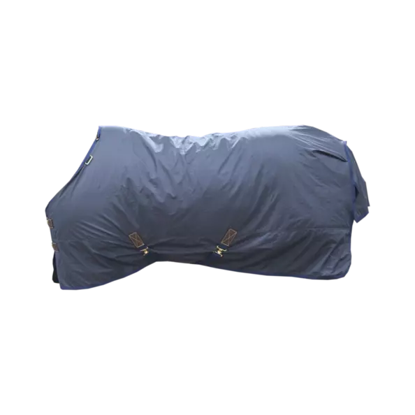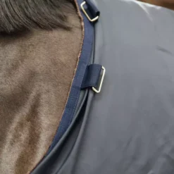 For 100% wind- and waterproofness we used the same material as we did for the horse raincoat, a PU coating. This coating is the same that’s used for the typical yellow fisherman jackets. The coating is applied to the outside of the rug and is therefore unique in the rug market. Thanks to the artificial rabbit skin on the inside of the rug, the rug is very soft on the skin and avoids rubbing marks. This lining also gives the horse a shiny coat and prevents a damp feeling under the rug. The 150g fiberfill filling offers your horse extra protection against cold weather. This filling creates, together with the artificial rabbit skin, an isolating layer that traps and retains the horse’s body warmth. The hurricane rug features two classic brass finish stainless steel closures at the front, two surcingles and a plastic-covered bungee cord which is detachable. The classic artificial leather patches and the gold details will make your horse look sophisticated, even on rainy days.