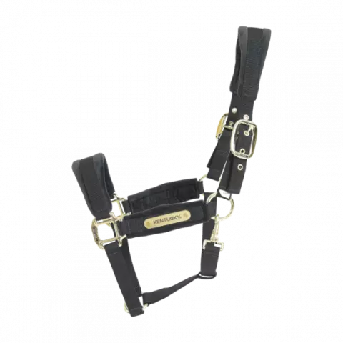 The halter is made from a strong nylon, to ensure your horse’s safety. The nose, cheek, and crownpiece are reinforced with velvet padding. This is very soft to touch and comfortable to wear. The halter closes with a gold brass carabiner hook and is adjustable on both sides of the crown piece for a perfect fit.