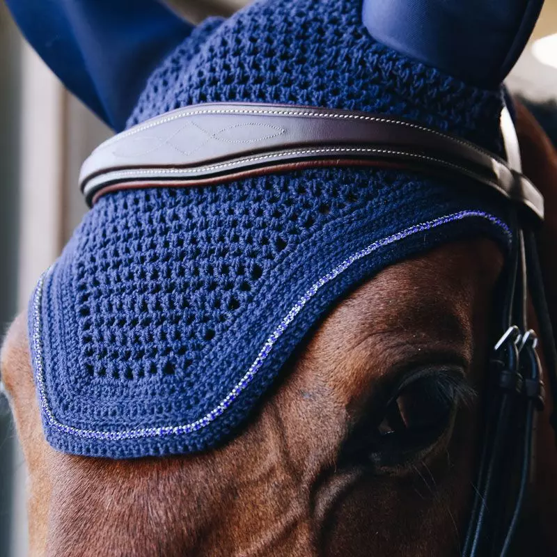 This fly veil is hand knitted for better durability. We added some sparkle by using sparkling yarn. The line of rhinestones in the same color as the fly veil really tops it off! The Fly Veil Sparkling does not have a visible logo, therefore rider or sponsors can embroider their own logo.