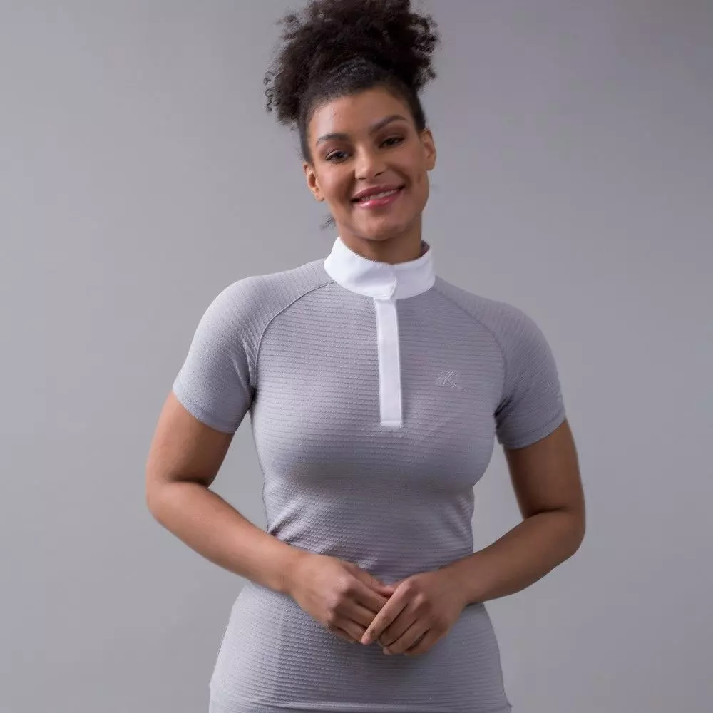 Grey short sleeved show shirt with white standing collar, body details with branding to sleeve and front.Â
