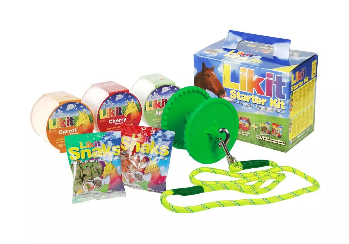The is the easiest way to start using Likits, this great value kit has everything you need to get started. Each Kit contains a Likit Holder, three assorted Likit (650g) refills as well as two bags of our popular Likit Snaks.