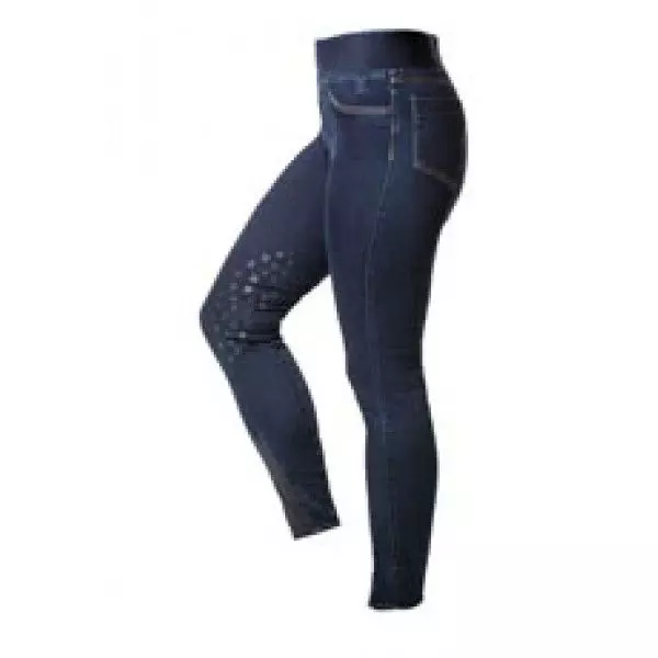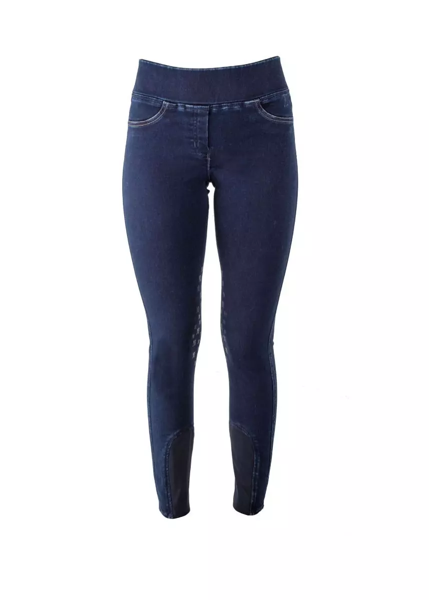 Jegging style breeches featuring faux front pockets, fly and functional back pockets. Contrasting stitching adds subtle detail. Silicone knee patch for added grip. Stretch panels at the ankle to provide a comfortable fit under boots or chaps.