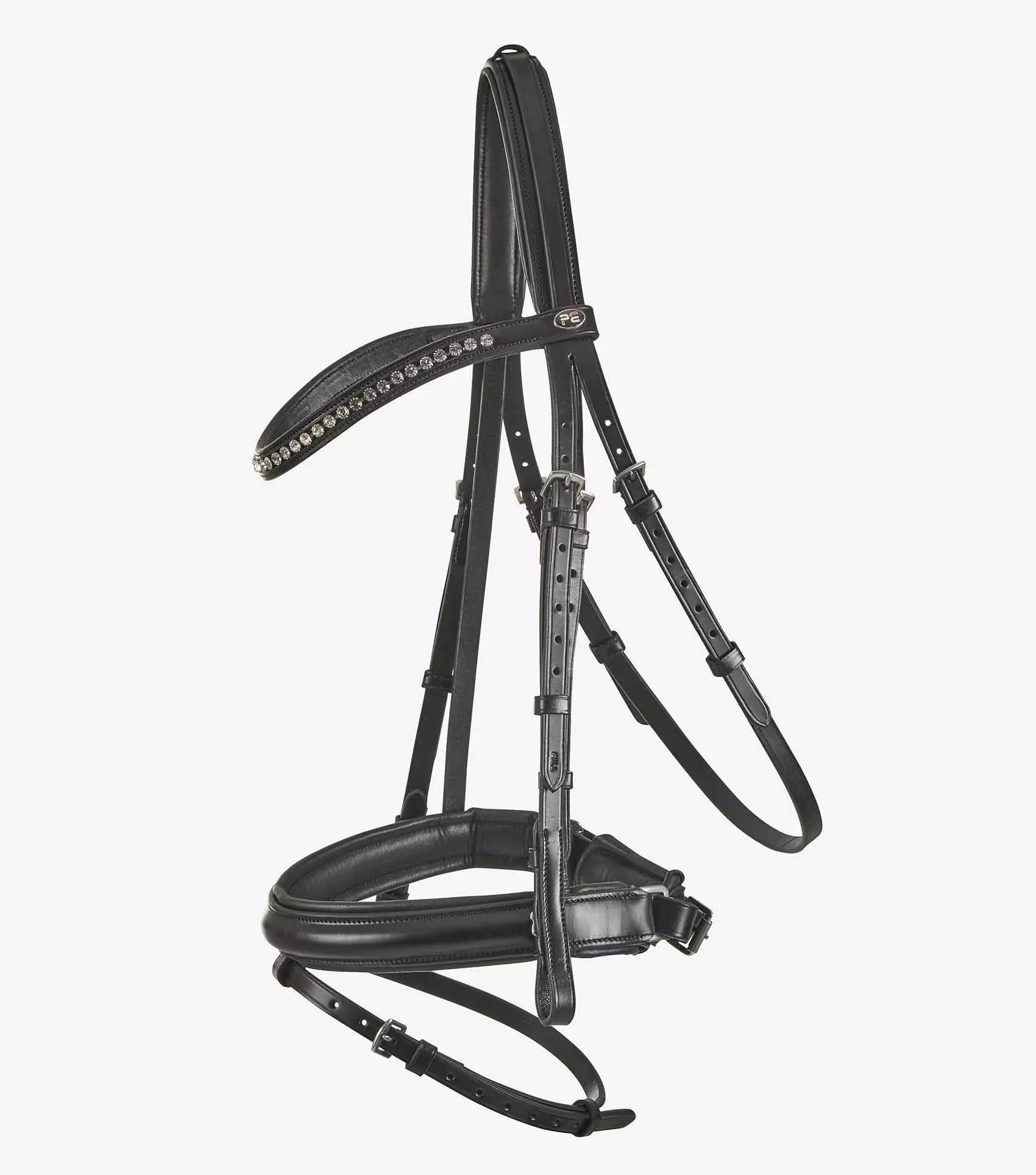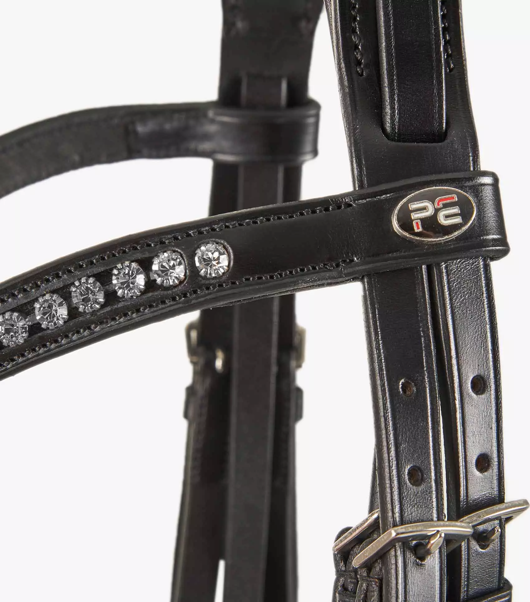 Crafted from the very finest Italian leather this crank bridle is sure to make a statement no matter what your discipline. The padded poll piece enhances comfort and the noseband is secured over the top, ensuring an even pressure is applied for heightened performance. An elaborate and intricate inset diamante chain sits neatly within the shaped browband, creating a sparkling outline which looks great whilst schooling or competing.