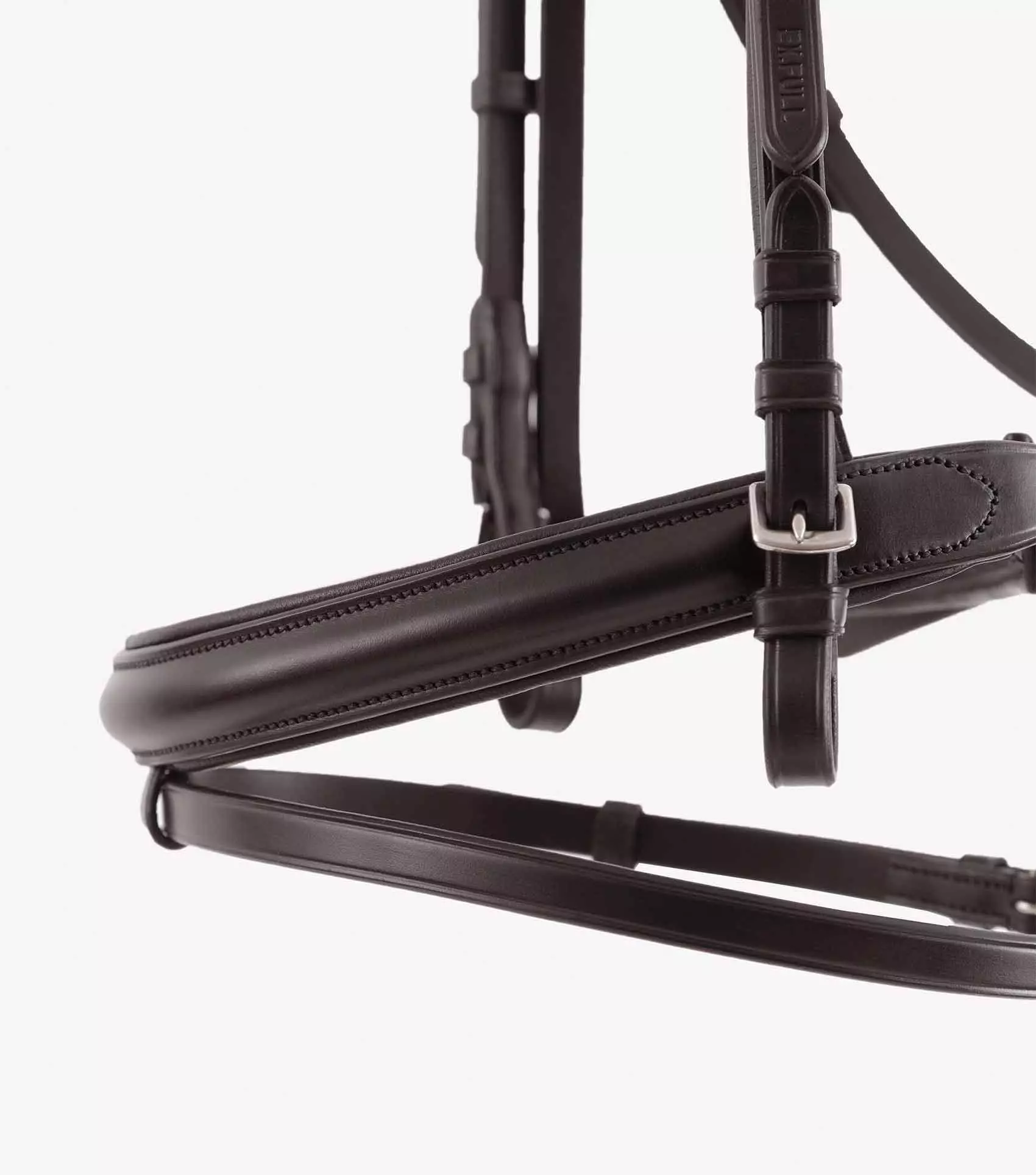 A delectably soft snaffle bridle crafted from Italian leather which will look the part in any equestrian discipline. The padded poll piece enhances comfort and the noseband is secured over the top, ensuring an even pressure is applied for heightened performance. A beautifully soft, padded browband with a round raised design sits neatly at the front, emphasised either side by two luxury ‘PE’ branded brooches.