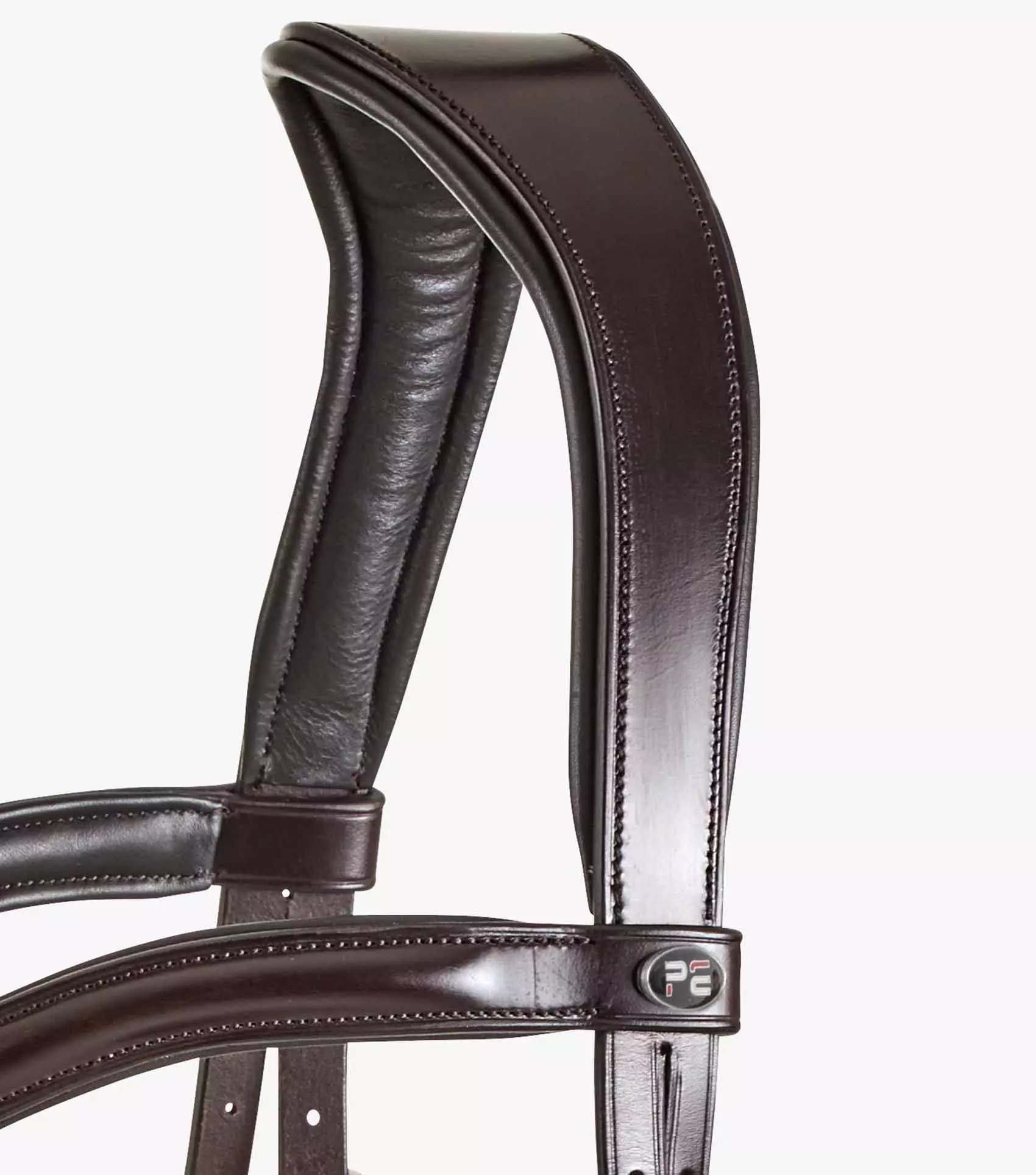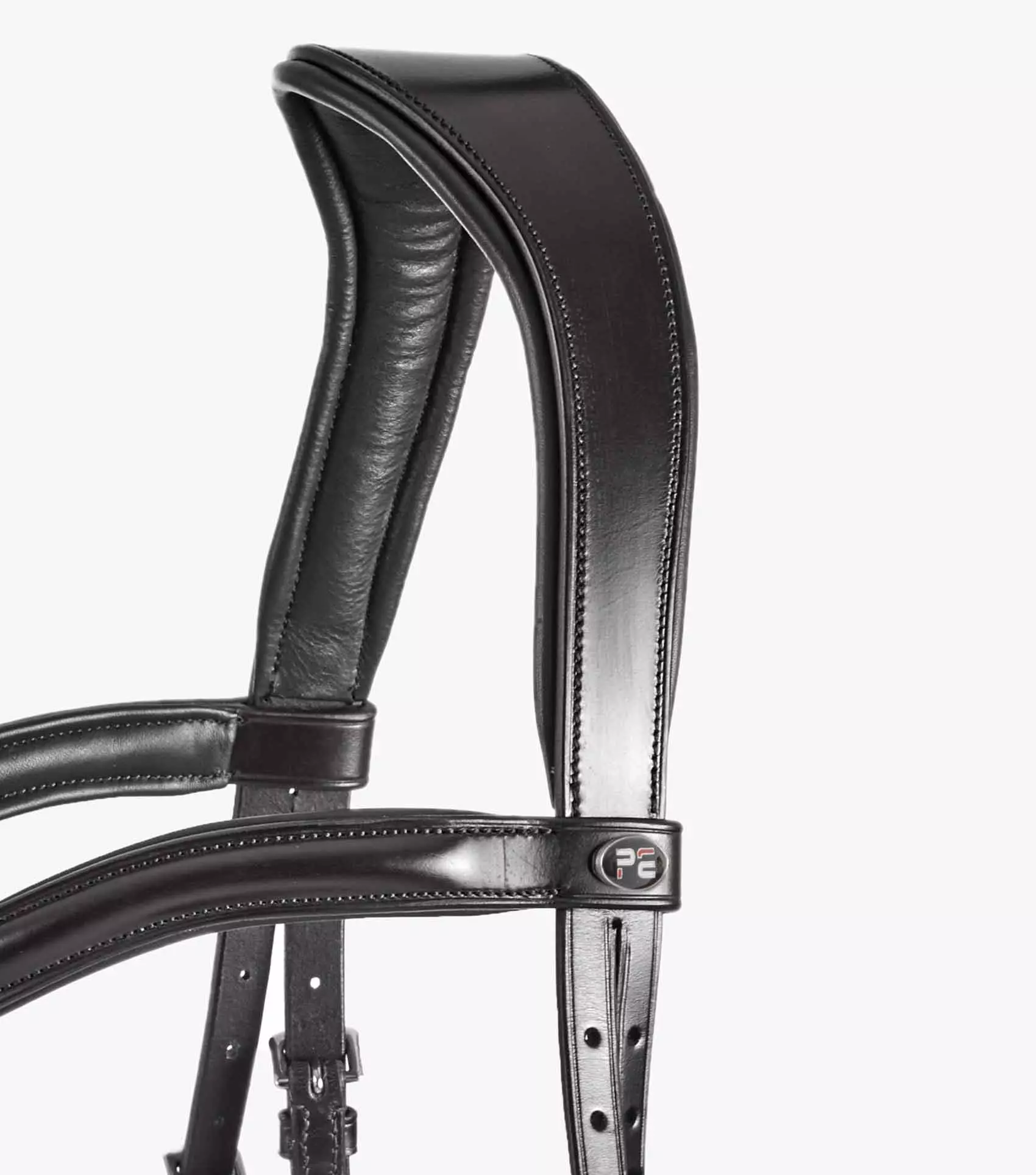 The anatomically shaped, padded poll piece has been crafted to distribute pressure over the less sensitive areas of the poll and away from the ears. A padded, shaped browband creates definition and the round raised design offers an elegant aesthetic. Our anatomically shaped snaffle noseband with integrated flash dips down to avoid contact with the horse’s cheekbones, alleviating pressure and potentially heightening performance.