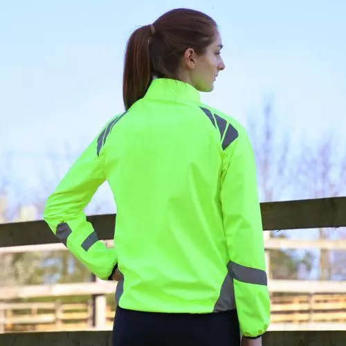 Be safe and seen during the darker evenings wearing this reflective jacket by Hy Equestrian. The breathable fluorescent yellow material provides visibility. Additional silver reflective patterns creates optimum visibility.