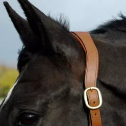 Gorgeous dark tan leather with a softee leather lining on the headpiece and noseband.The anatomically shaped headpiece is designed to curve gently behind the ears alleviating pressure and or rubbing.With an adjustable noseband and trigger clip throat latch for ease of use.