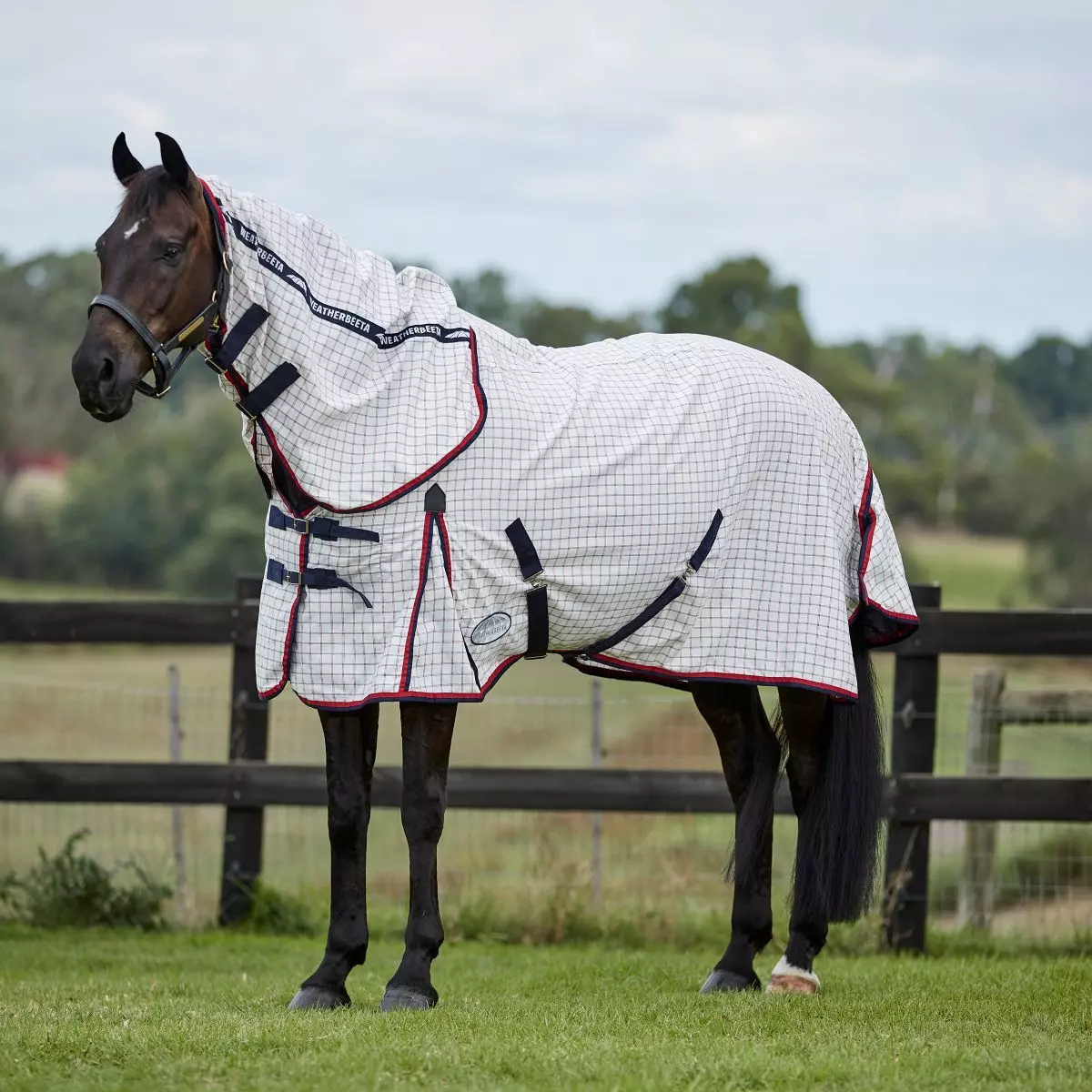 The WeatherBeeta Summer Sheet Lite IV Combo Neck is a breathable and cool 190g polycotton summer sheet providing 95%+ UV protection in a Combo Neck style offering premium protection for the warmer months. Shaped back to better fit the curve of the horse’s back with wither relief pad for additional comfort and lined shoulders, mane and tail flap to prevent rubbing. Featuring two touch tape tabs on neck portion, traditional side gussets for natural movement, full wrap tail flap, twin web buckle chest strap and twin low cross surcingles with adjustable and removable leg straps.